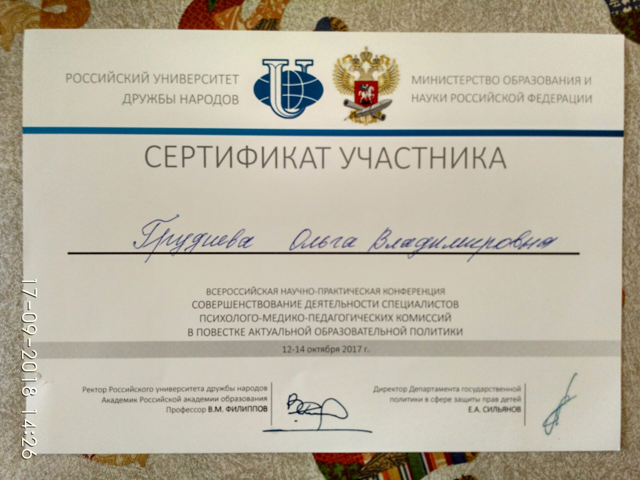 - Октябрь 2017 года. Учебно-научный институт сравнительной образовательной политики РУДН. "Использование в работе руководителей и специалистов психолого-медико-педагогических комиссий пакетов диагностических методик (0-23 лет)"